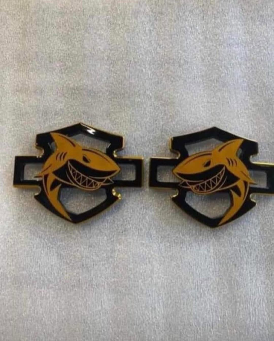 Finished in a deep gloss black base with a bold metallic gold shark overlay, this emblem delivers a rich, high-contrast look. The warm gold tone adds a premium, custom feel while standing out sharply against the glossy black background, creating a sleek and aggressive design with eye-catching shine.