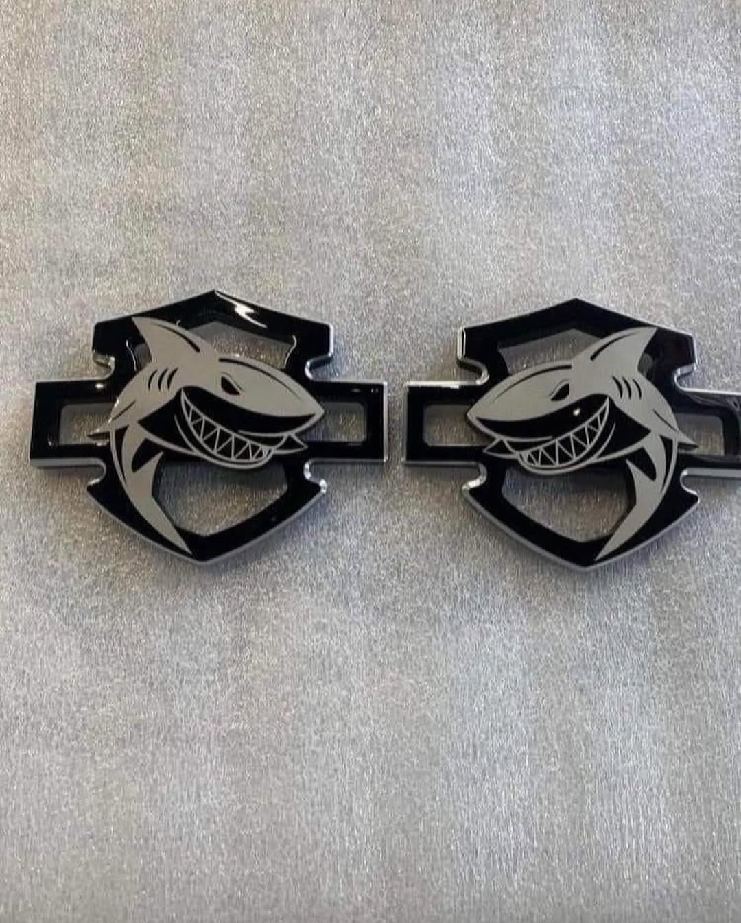 Finished in a deep gloss black base with a bold satin silver shark overlay, this emblem delivers a clean, aggressive contrast. The smooth metallic silver design stands out sharply against the high-gloss black background, creating a sleek, custom look with a modern edge and subtle reflective highlights.